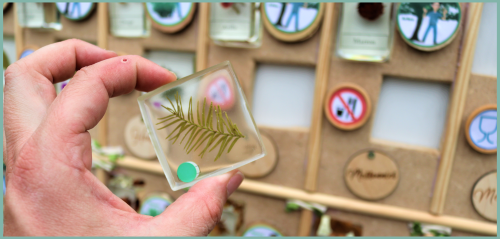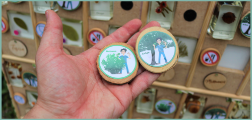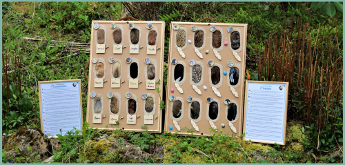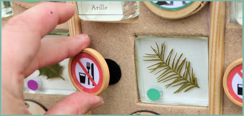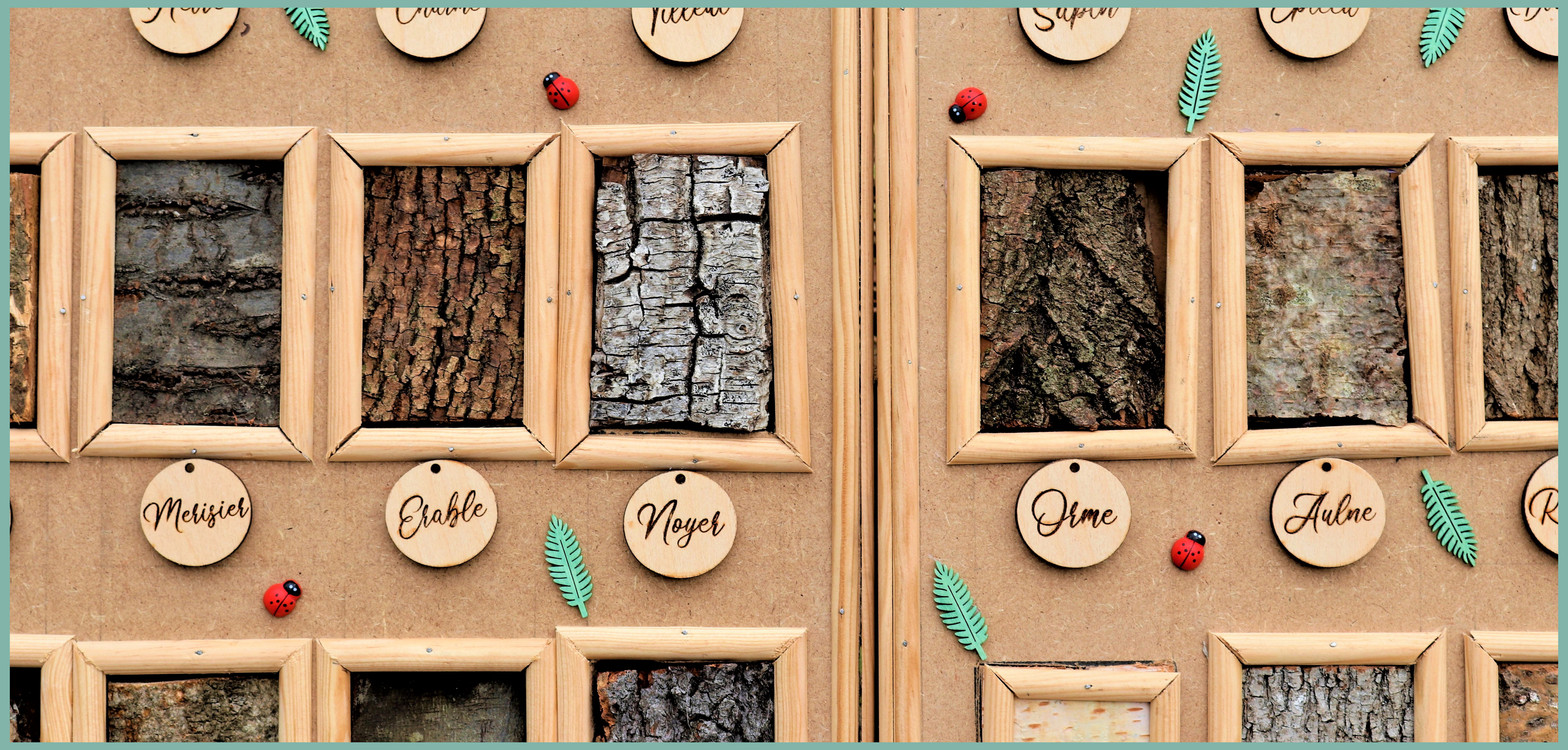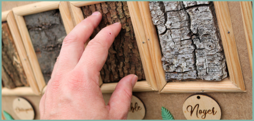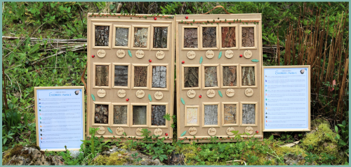 En premier, exposition au Public de la plupart des écorces des arbres qui composent notre Flore. Puis identification de ces essences par l’intermédiaires des « cadres indices » ainsi que d’étiquettes à replacer à certains endroits spécifiques. Utiliser ses sens est à exploiter pour arriver à son but.