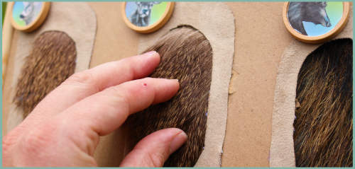 Identification des robes (pelages et plumages) de la Faune sauvage par le biais des cadres « indices » ainsi que les sens (vue, touché odorat) afin de repositionner les étiquettes « Noms » dans un premier temps puis les médaillons « Portraits » en suivant, aux places qui leurs sont réservées spécifiquement.