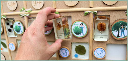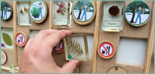 Quatre étapes pour cet atelier. 1 : présentation du panneau de jeu. 2 : positionnement des essences dans une strate (arbre ou buisson) à l’aide d’étiquettes. 3 : identification et placement aux endroits spécifiques de binômes « Feuilles et Fruits » via les résines. 4 : indication de la consommation ou non.