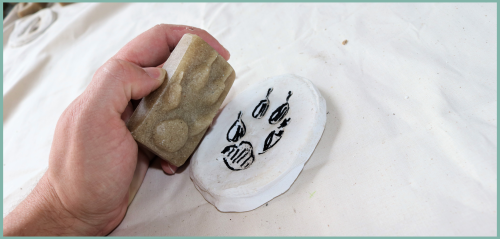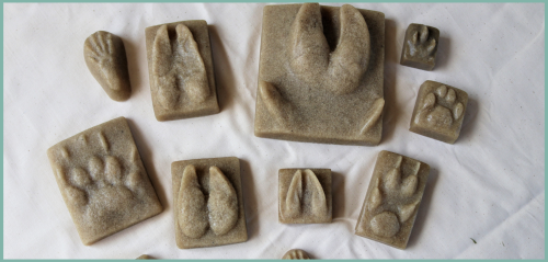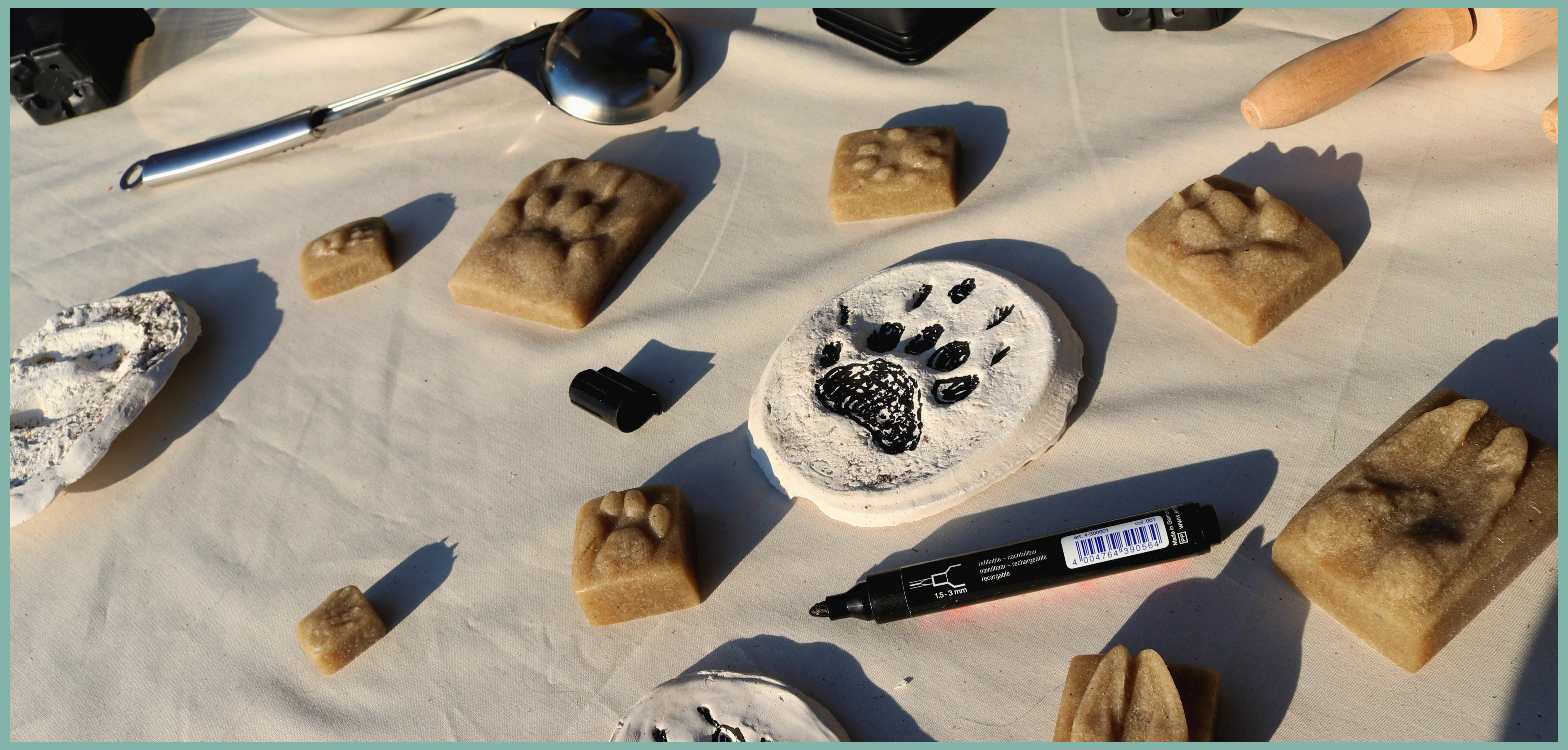 Dans un premier temps, identification de plusieurs empreintes d’animaux sauvage par l’intermédiaires de gabarits en résine. En second, réalisation d’une d’empreinte (par participants) en plâtre en suivant la technique du « moulage en pot ». Et pour terminer (après un temps de séchage indispensable), démoulage des créations.